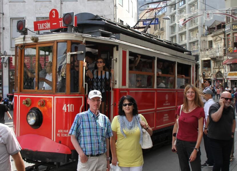 Vom Taksim-Platz geht ins die berühmte Einkaufszone Istiklal Caddesi. Dort fährt die bekannte Tünel-Strassenbahn durch die Fussgängerzone.