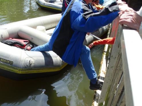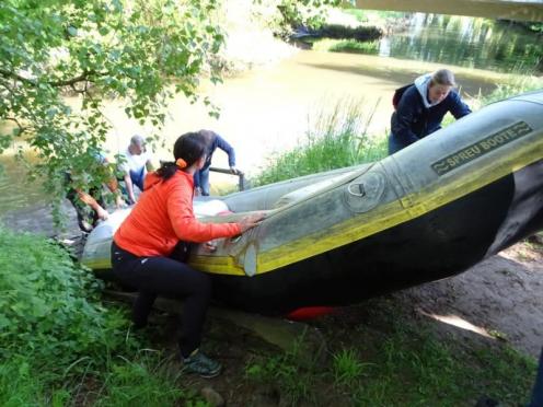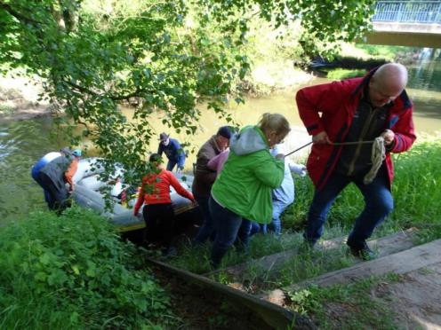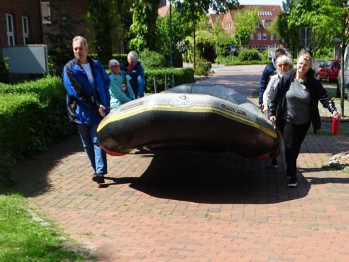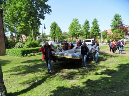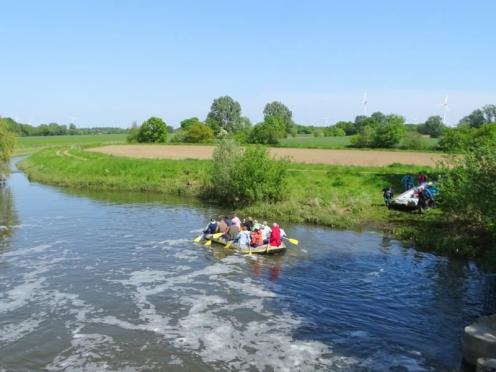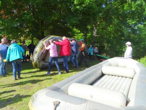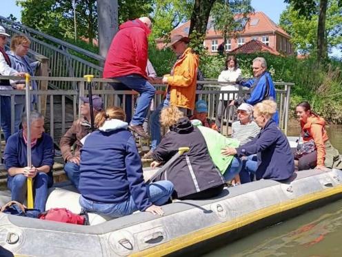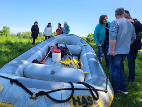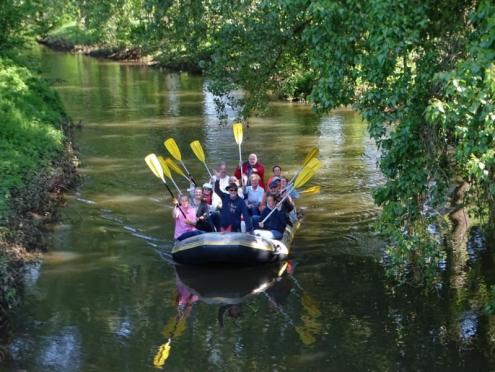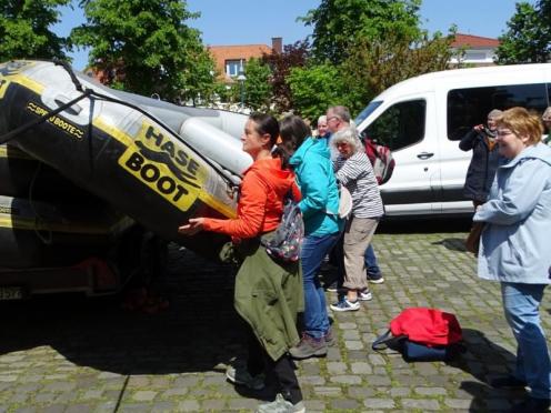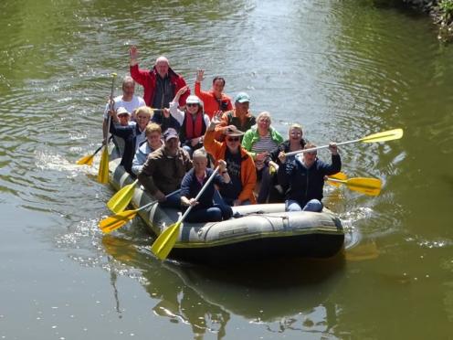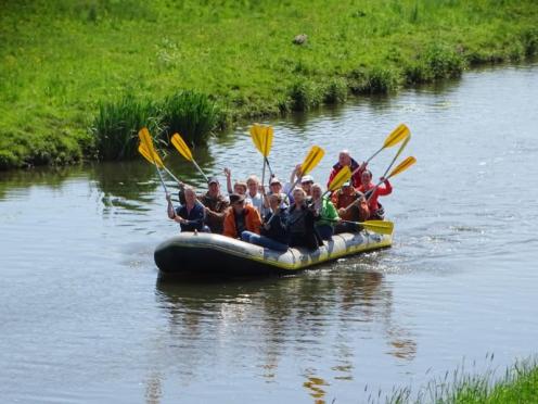 Nur in Bramsche-Sögeln müssen wir die Boote kurz aus dem Wasser ziehen und 50 Meter zur Alten Hase tragen. Für viele von uns ist es die erste Schlauchbootfahrt auf der Hase. Man erlebt die Natur aus einem ganz anderen Blickwinkel. Am Ziel in Rieste ziehen wir die Boote aus dem Wasser und helfen beim Verladen. Und dann folgt die zweite Runde, unser gemeinsames Essen im Restaurant "Dimitrios" in Bramsche. (18.05.2023)