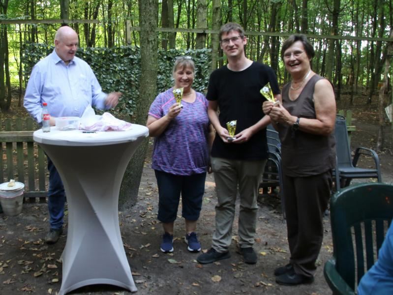 Nach dreieinhalb Stunden Spiel und Spass sind die Gruppen fertig. Die Besten liegen dicht beieinander, aber es ist kein Stechen notwendig. Weltmeister im Fussballgolf sind Claudia, Irmgard und Manuel, die ihre Siegerpokale stolz in Höhe recken. Nun beginnt die zweite Halbzeit in der Grillhütte. Jörg grillt die Würstchen und Steaks wie ein Fachmann. Nach acht Stunden ist ein schöner Tag leider zu Ende. (19.08.2023)