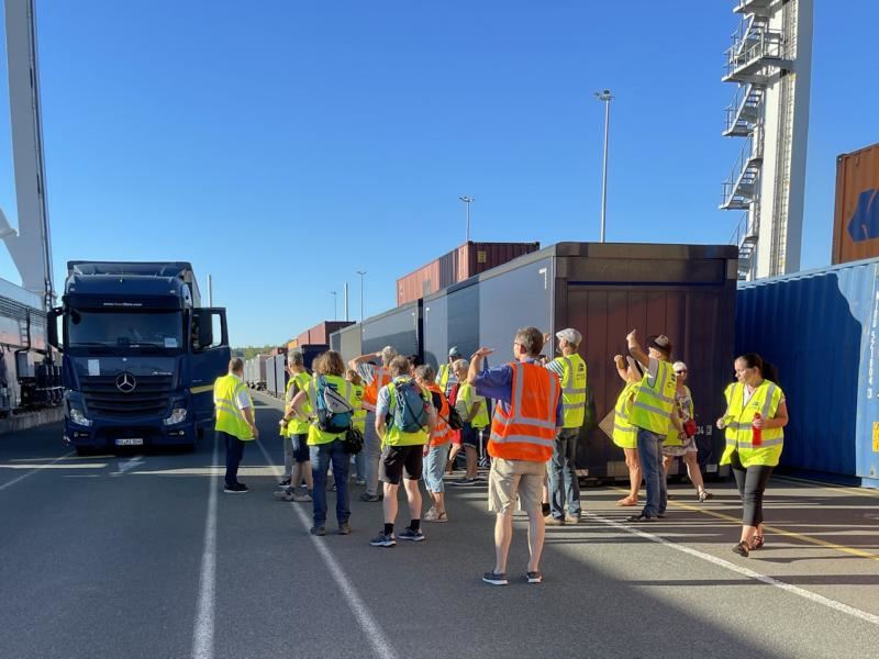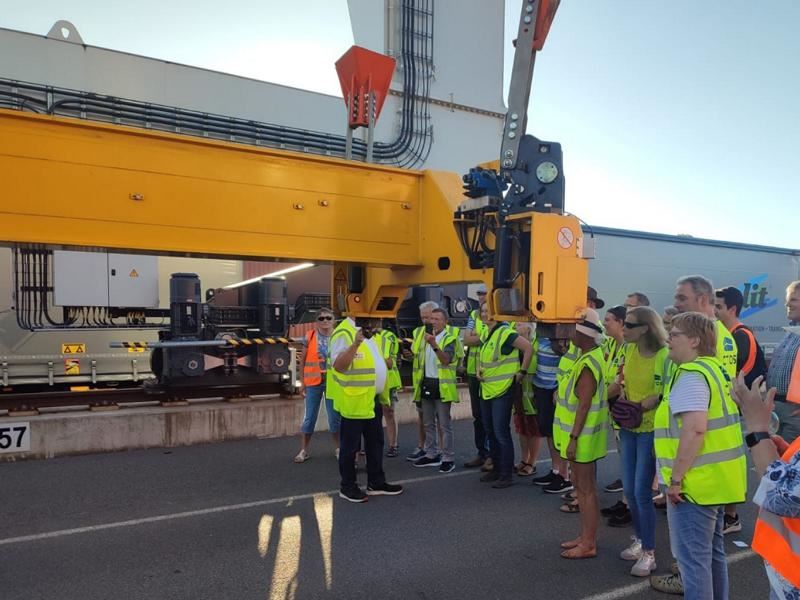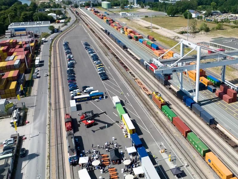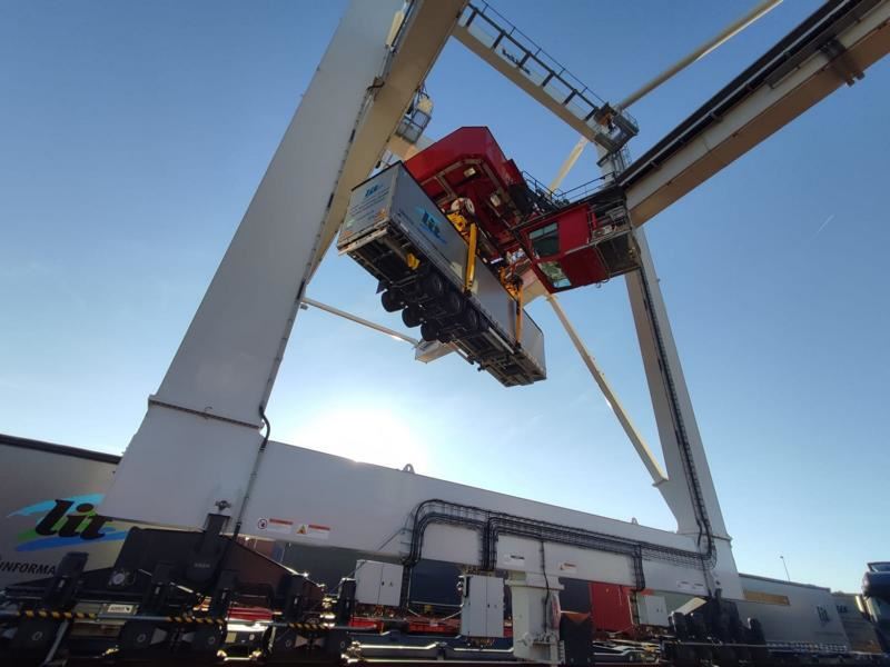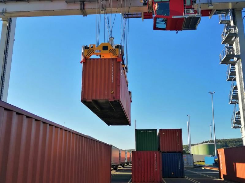 Zwei 40 Meter hohe Portalkräne verladen die Container oder komplette Sattelauflieger auf 700 Meter lange Züge. Die mögliche Kapazität beträgt 150.000 Container pro Jahr. (06.09.2023)