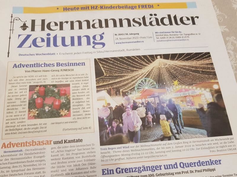 Hermannstadt (Sibiu) ist das Zentrum der Siebenbürger Sachsen. Seit 1866 erscheint dort die Hermannstädter Zeitung in deutscher Sprache. Beim Redaktionsbesuch erfahren wir viel über die Geschichte von früher einmal 1,5 Millionen Deutschen in Rumänien. Dann sind wir auf dem schönsten Weihnachtsmarkt des Landes. Viel Licht und Glitzer. Auf dem Rückflug stellen die Teilnehmer fest: "Rumänien haben wir uns ganz anders vorgestellt." (04.-08.12.2023)