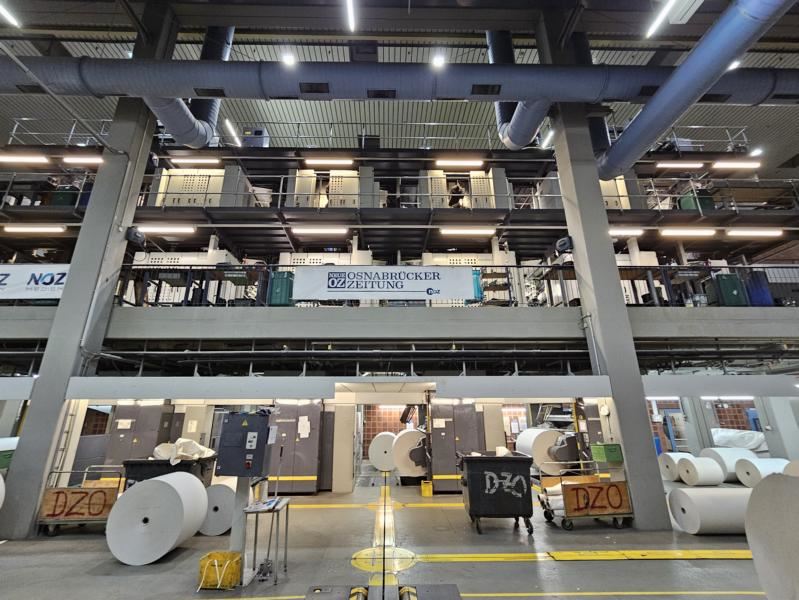 Um 19.30 Uhr erfolgt der Andruck der Neuen Osnabrücker Zeitung. Die beiden Druckstrassen schaffen jeweils 30.000 Zeitungen pro Stunde. Die ersten Exemplare landen bereits vor Mitternacht in den Briefkästen der Abonnenten.