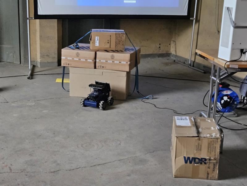 Ein Roboter arbeitet in einem Muster-Paketzentrum und befördert Pakete ohne Menschen vom Absender zum Empfänger. Nach der Vorführung geht es in die Ausstellung. Insbesondere die Damenwelt ist sofort in den kleinen Roboter "verliebt". (01.08.2024)