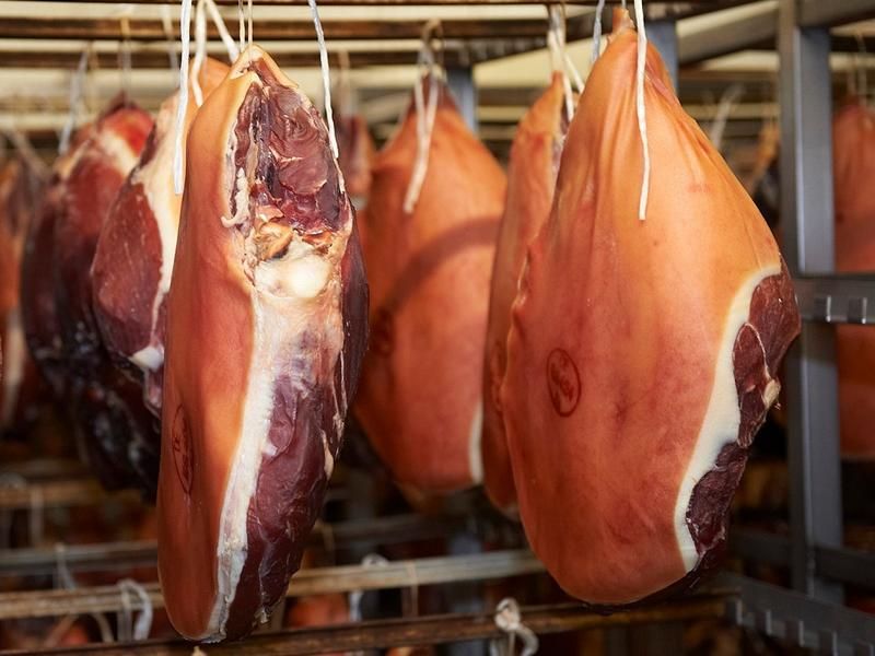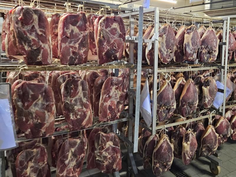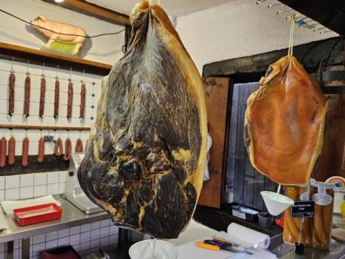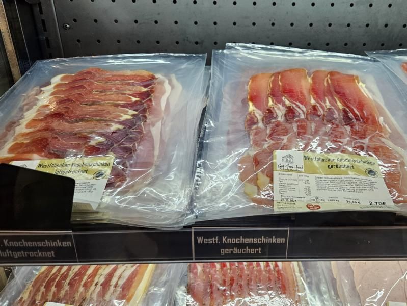 Die Herstellung des Westfälischen Knochenschinkens ist nicht einfach und geht auch nicht schnell. Nach dem Einpökeln dauert es über sechs Monate, bis die Schinken geräuchert oder luftgetrocknet in den Laden kommen. Der Juniorchef erklärt uns die einzelnen Arbeitsschritte vom Einsalzen über das Trocknen bis zum Räuchern.